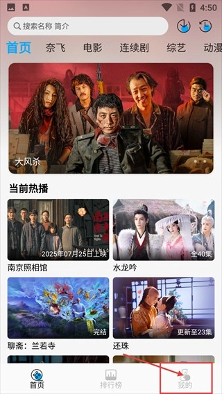 1、打开软件首页,可使用搜索功能查找影视内容,点击底部【我的】进入个人页面。