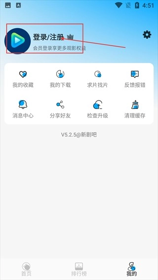 2、在个人页面,点击【登录/注册】区域,可进入登录流程,登录后可享受会员观影权益。