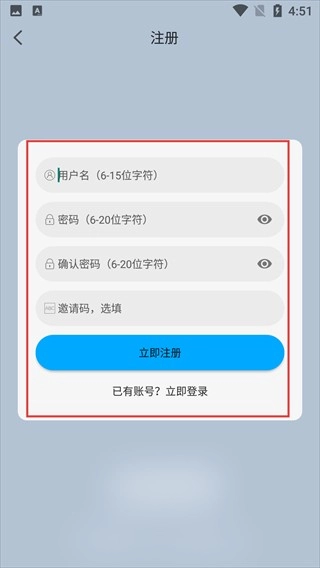 4、进入注册页面,依次填写【用户名】【密码】【确认密码】,邀请码选填后点击【立即注册】完成注册。