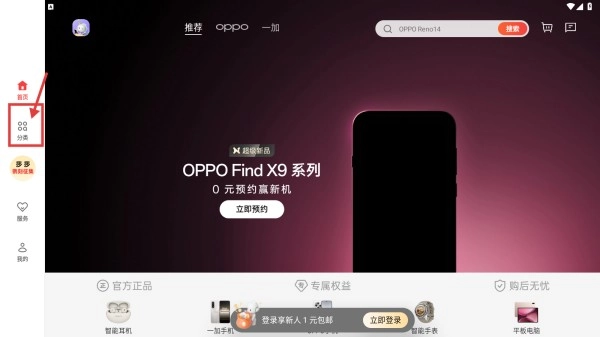 1、打开oppo欢太商城应用,点击左侧分类选项,展开分类列表。