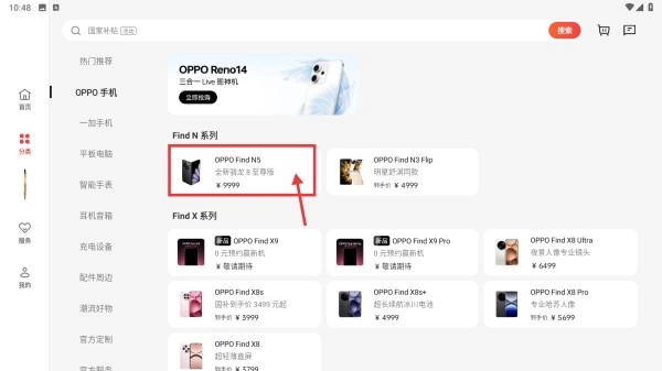 3、在OPPO手机商品页面,点击OPPO-Find-N5机型,进入商品详情页。