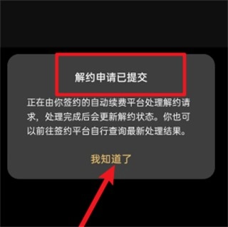 5、之后,再点击取消,显示解约申请已提交,点击我知道了就可以了。