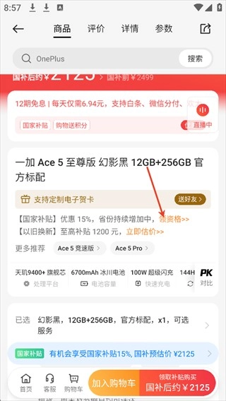 2、进入购买详情页,按照图示箭头,点击申请国家补贴领取资格。