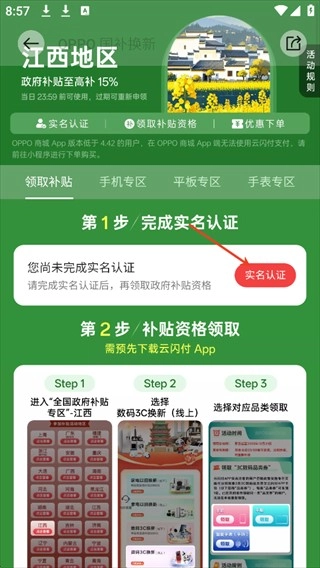 4、按照领取国补的操作指引,点击箭头所示的实名认证,然后进行认证。