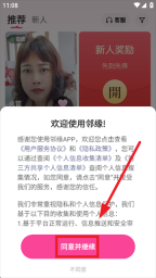 先把邻缘这个应用装到设备上,接着启动它。当看到“欢迎使用邻缘!”的提示页面时,找到“同意并继续”的按钮点一下。