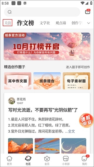 1、在作文纸条App的主界面上点击“关注”选项;