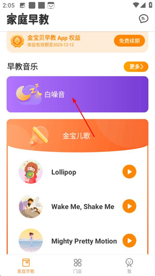 1首先找到金宝贝早教的主页面,接着在页面中找到并点击白噪音相关的功能入口,这样就能进入到可供挑选白噪音的页面了。