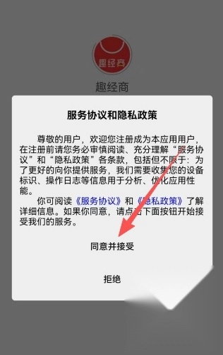1、打开趣经商点击同意并接受