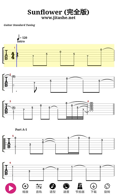 3. 竖屏时可查看文本形式的吉他谱,切换至横屏则显示六线谱,同时配备了自动滚动翻页的功能;