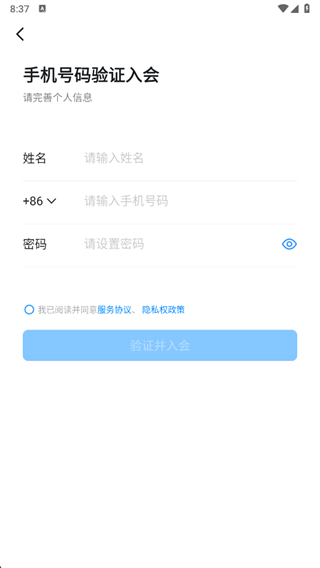 3、你可以选择手机号验证入会登录,输入名字和手机号还有密码。
