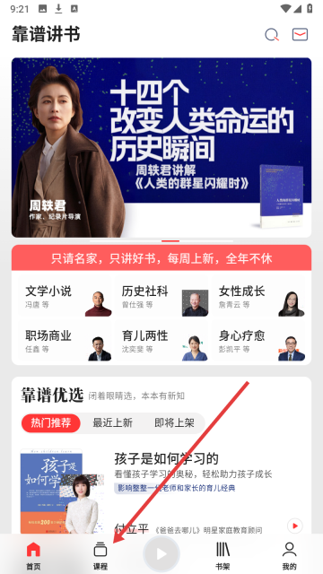 1、点击底部的【课程】选项,进入精讲课程页面,开启你的知识探索之旅。