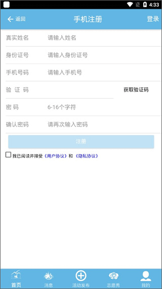 2进入首页后,能看到志愿活动展示,还有志愿资讯、爱心基地等相关服务板块,此时点击“注册志愿者”按钮即可。