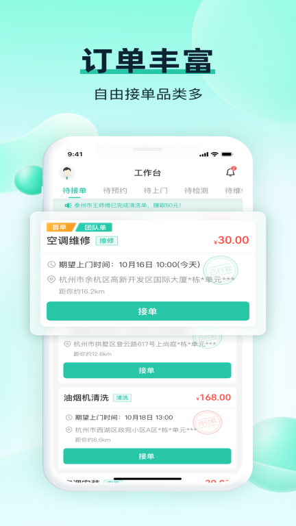 3借助智能匹配、订单处理、报价及收款等一系列功能,能帮助服务人员更高效地安排工作事务,提升工作效率的同时,也有助于增加个人收入。