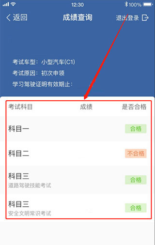 5、登录完成后,页面会跳转至成绩界面,这里将展示过往所有考试记录对应的成绩信息。