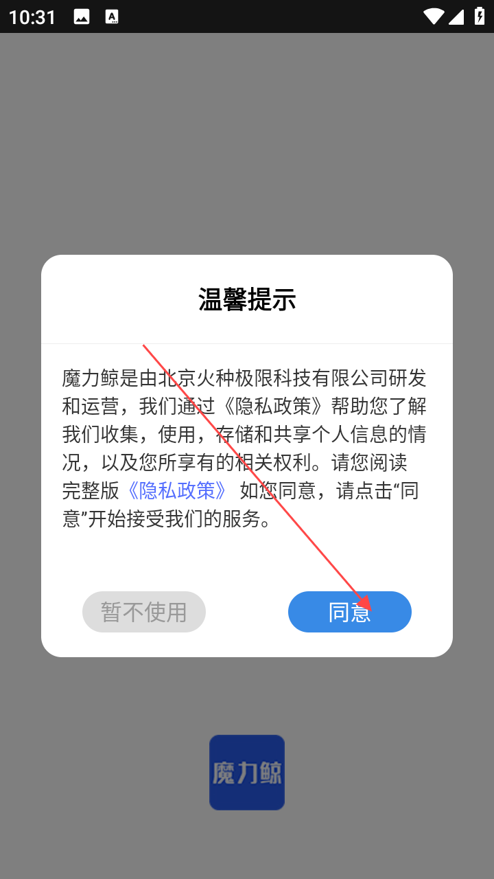 目前,该平台每天可以处理五十多万笔回收相关的业务订单,其智能导航系统的定位精准程度更是达到了百分之九十九,为推动绿色循环经济体系的构建提供了有力的数字化技术支持与服务方案。1首次启动魔力鲸应用时,仔细阅读弹出的温馨提示内容,确认无误后点击页面上的【同意】按钮即可继续使用。