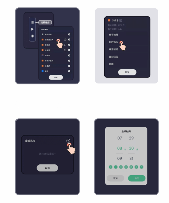 4、设置自动点击:在录制好的脚本中可以设置自动点击的频率、延迟时间等参数,支持定时执行功能,可以设置在特定时间自动开始和停止点击任务。