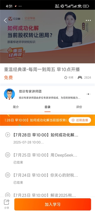 亿企学会App是一款专业的财税知识学习软件,专注于为财税从业者提供体系化、高质量的课程、资讯及咨询服务。平台以“学以致用方为会”为宗旨,汇聚财税行业名家与实战专家,通过多维度的课程体系,深度剖析企业税务风险与经营隐患,并提供专业解决方案。亿企学会App涵盖171财税情报局、财税早班车、名家专栏及直播等丰富资源,聚焦新政解读与实操干货,帮助用户高效提升财税技能,足不出户实现职业成长。