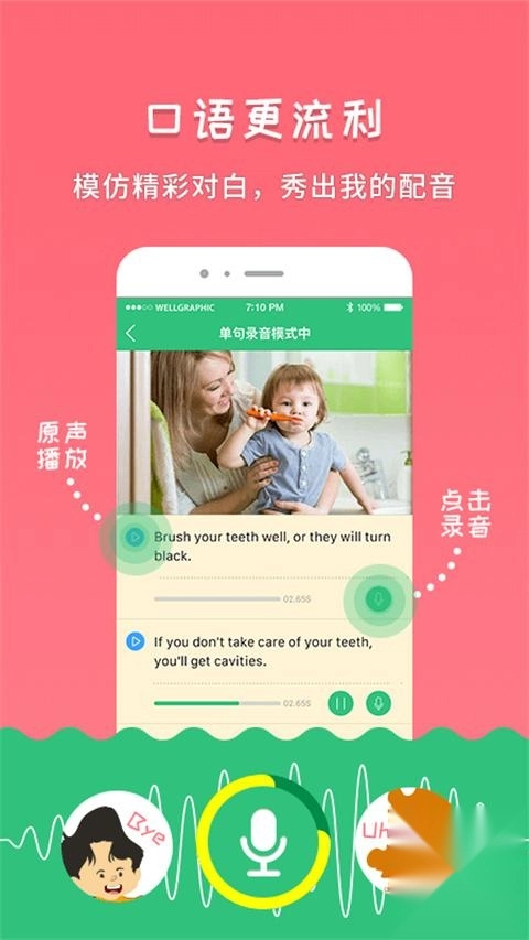 3、借助视频片段进行学习,模仿其中的单词发音;在观看视频的过程中,还能自己录音配音,通过反复练习来巩固。