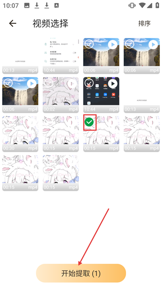 3、在视频选择界面,挑选好要提取音频的视频后,点击【开始提取(1)】按钮,即可进入音频提取流程。