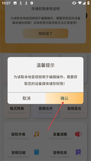 2当系统弹出关于存储权限的提示框时,点击其中的确认按钮,这样就能获取设备的媒体存储权限,以便后续操作顺利进行。
