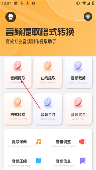 1、在应用主界面找到并点击【音频提取】功能模块,即可进入音频提取的操作流程。