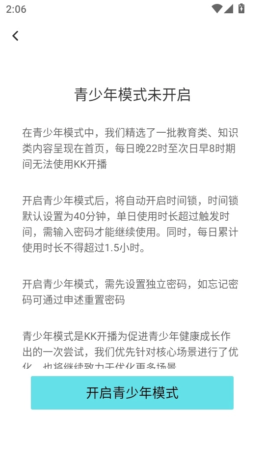 6.在之后进入新的功能菜单界面,点击“开始青少年模式”按钮进入下一步
