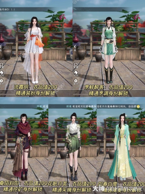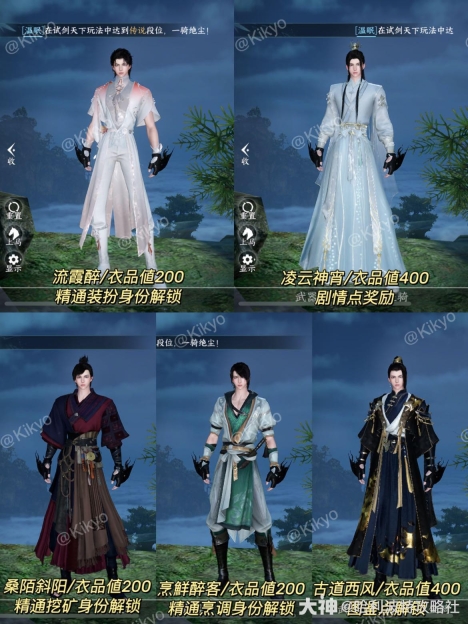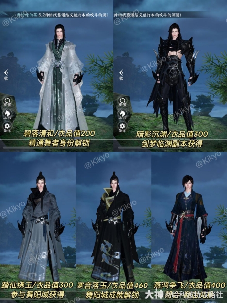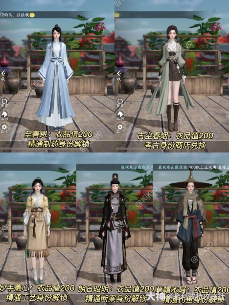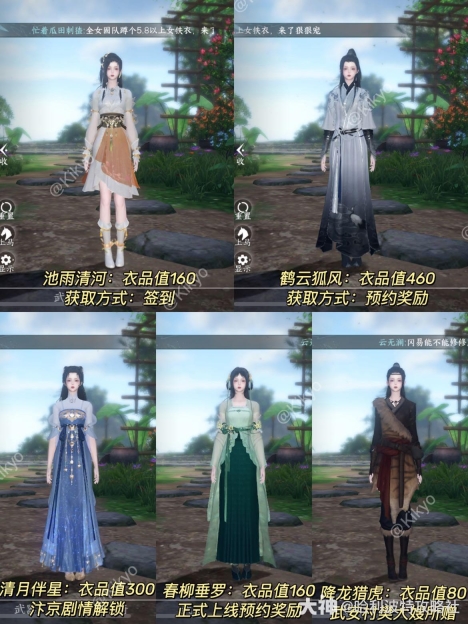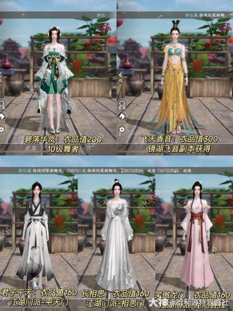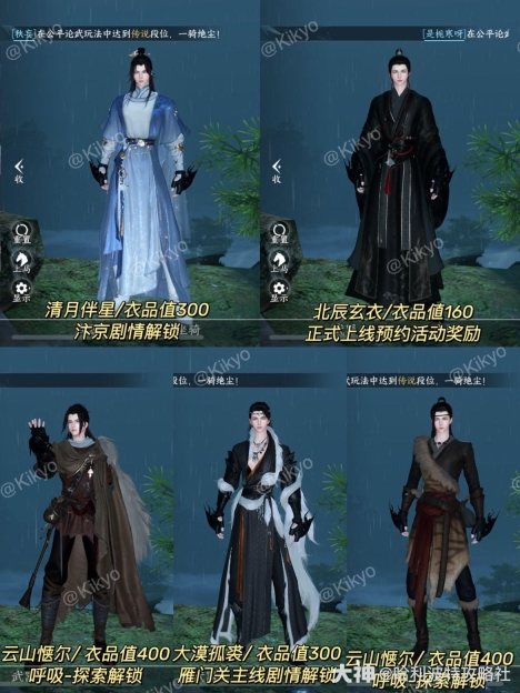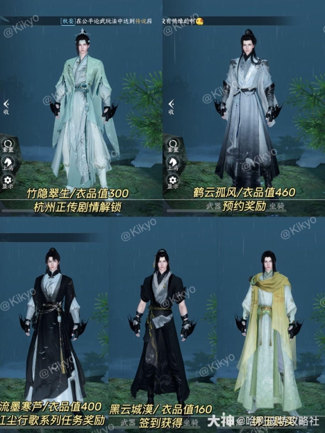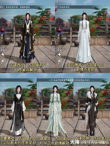 有一款时装可通过战令系统解锁,其衣品数值为三百;另有五款时装需使用绑定玉在商城兑换;剩余的时装则可通过体验剧情、提升身份等级、加入门派或挑战副本等多种途径获取。