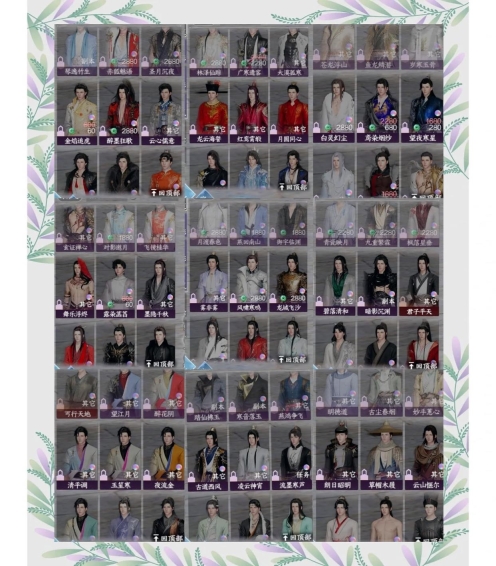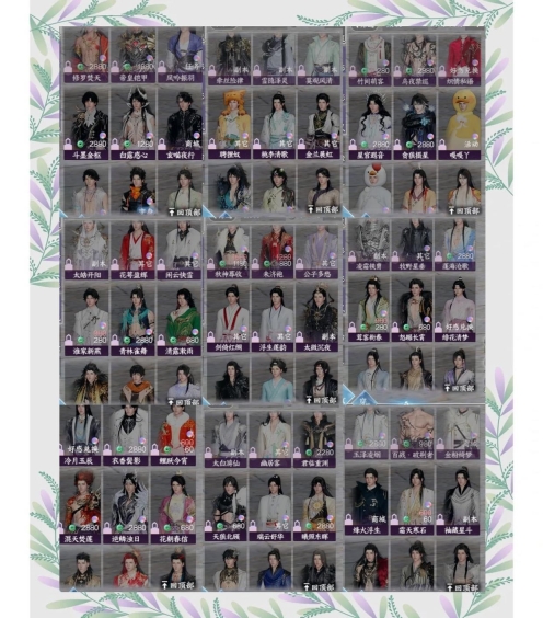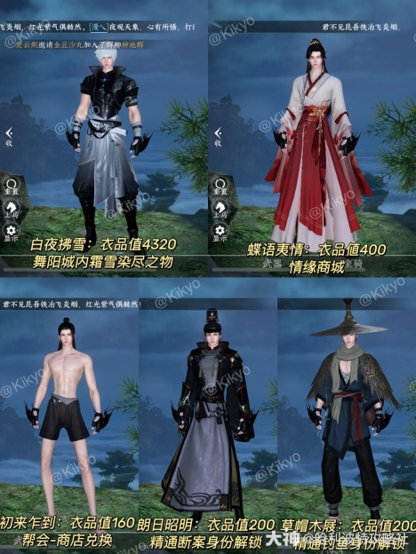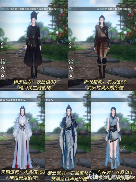 6套可用绑玉购买的时装如下:1⃣️雨霁霜寒,衣品值200,需680绑玉;2⃣️寒江问渡,衣品值160,需680绑玉;3⃣️徽仪柔怀,衣品值200,需880绑玉;4⃣️春江初晴,衣品值300,需1280绑玉;5⃣️离火苍冥,衣品值300,需1280绑玉;6⃣️月榭清嘉,衣品值400,需1680绑玉。