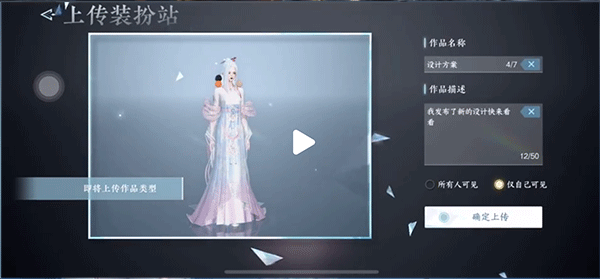 2、找到“上传分享”按钮点击,接着选择“上传装扮站”选项,然后输入作品名称,再根据需求选择“所有人可见”或“仅自己可见”的权限,最后点击确认上传就完成了。