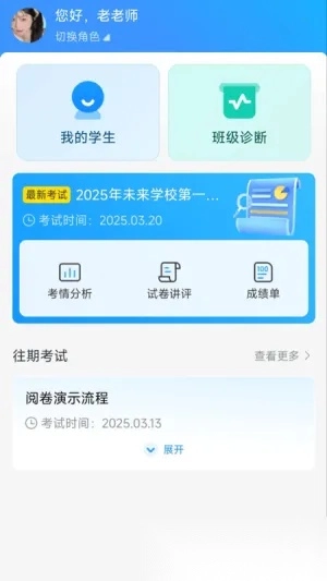 1. 可查看班级和年级过往各次考试的数据,其中包含平均分、成绩分布等信息。