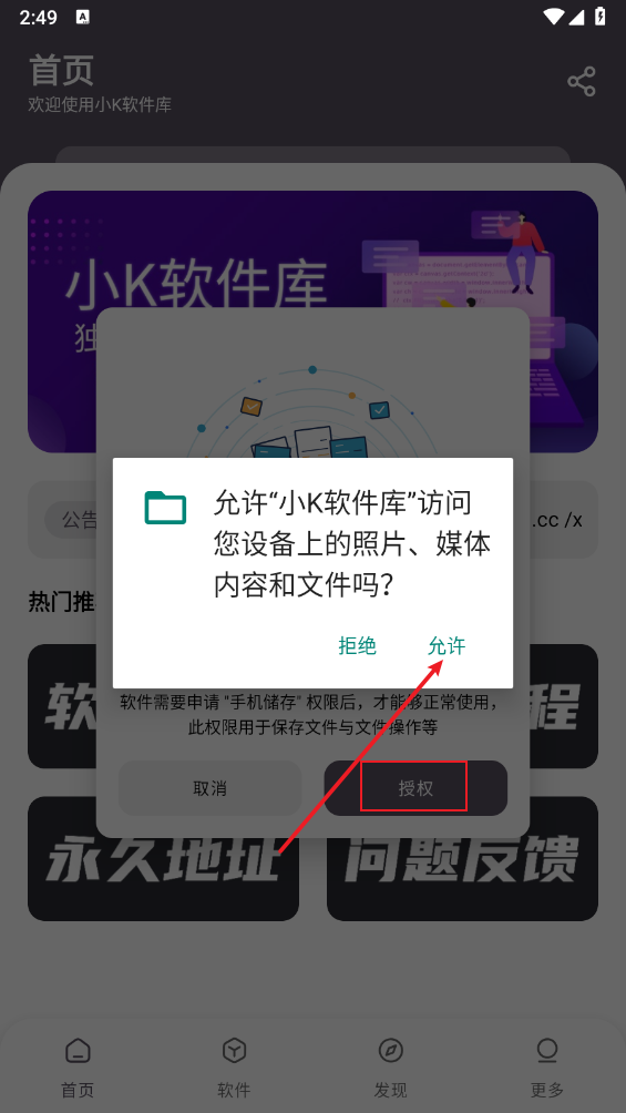 1、先在本站安装软件,打开软件后找到“授权”按钮并点击,同意授予相关权限以允许访问。