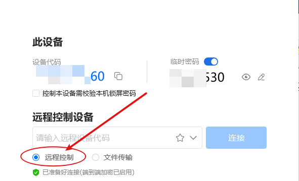 1、首先要打开电脑,获取其设备码与临时密码,然后选择远程控制功能。