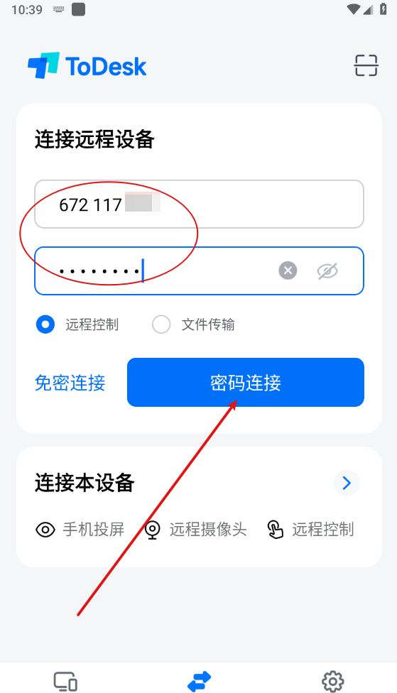 2、接着在手机端登录进入后,输入电脑的设备码与密码,点击“密码连接”按钮。