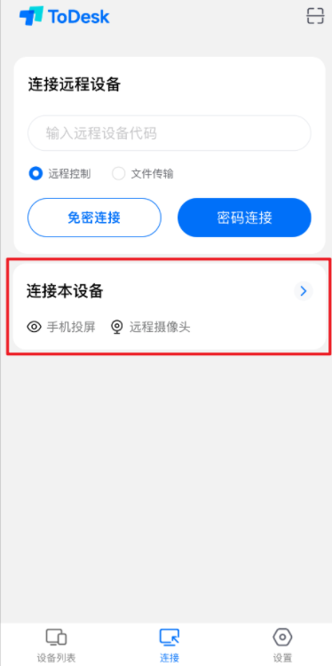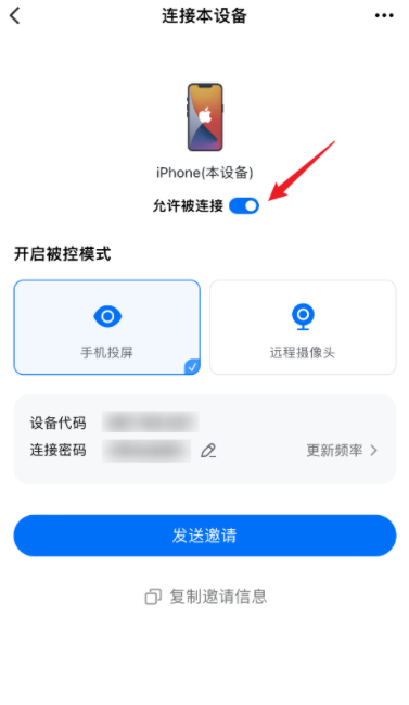 4、在主控端输入对应的设备代码与连接密码,就能完成投屏操作。