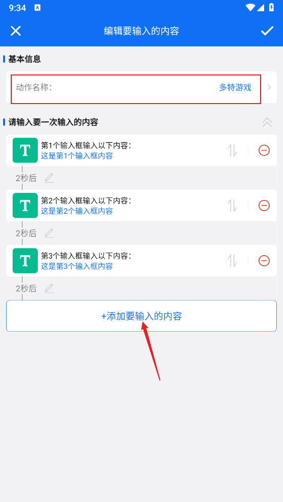 8、在编辑页面能够自定义动作名称,点击“添加要输入的内容”按钮即可。