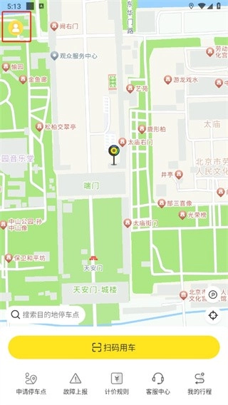 1、第一步先打开小黄鸭出行APP,进入首页之后,除了可以直接扫码用车外,还能点击页面左上角的【人像图标】;