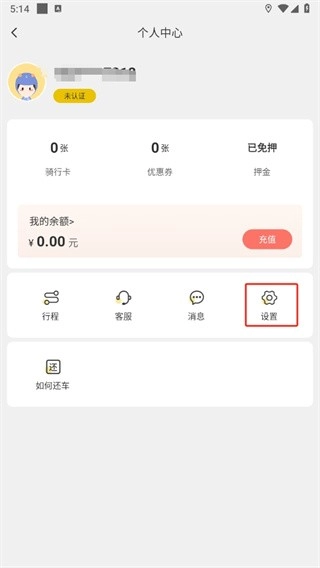 2、接着在个人中心页面里,能看到行程、客服、消息、设置以及如何还车这些功能选项,找到并点击【设置】;