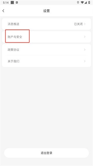 3、接着进入设置页面,能看到消息推送、账户与安全、政策协议、关于我们这些选项,此时需要点击【账户与安全】。