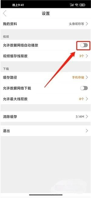 进入设置页面后,找到【允许数据网络自动播放】选项,点击其右侧的开关按钮将其关闭。