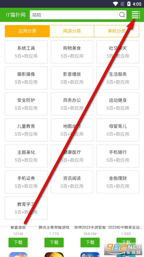 打开IT猫扑网,界面布局和网页版类似,设有首页、应用、网游、单机、专题等多个分类板块。