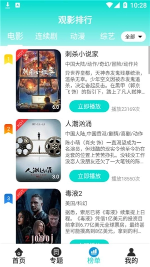 接下来你可以进入观影排行页面,查找你感兴趣的热门电影、电视剧、动漫、综艺节目等内容。