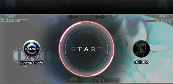 当玩家在曲目界面进行单击操作后,便会进入游戏准备界面。点击界面中间的START键即可开启游戏——该按键通常显示为蓝色圈,若对应曲目是隐藏曲目,则会呈现红色圈。在START键的左右两侧,分别设有pop-up mode设定按钮和click fx设定按钮。