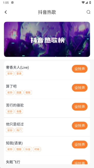 在抖音热歌页面,用户能够了解各类最新的热门歌曲,还可以快速将其设置为铃声。