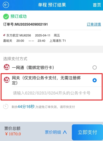 5.输入公务卡号支付机票款,完成订购。