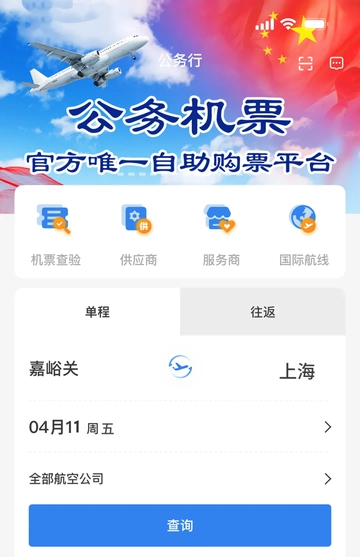 2.打开“公务行”进行登录,首页选择出发地、目的地及时间后点击查询。