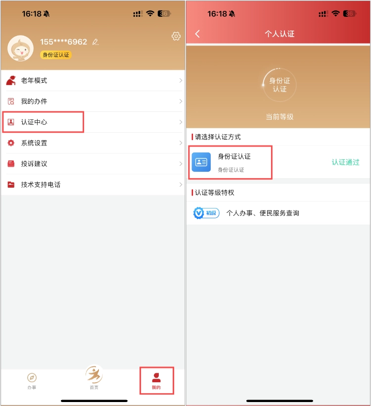 登录成功后,点击【我的】-【认证中心】,完成身份证认证。