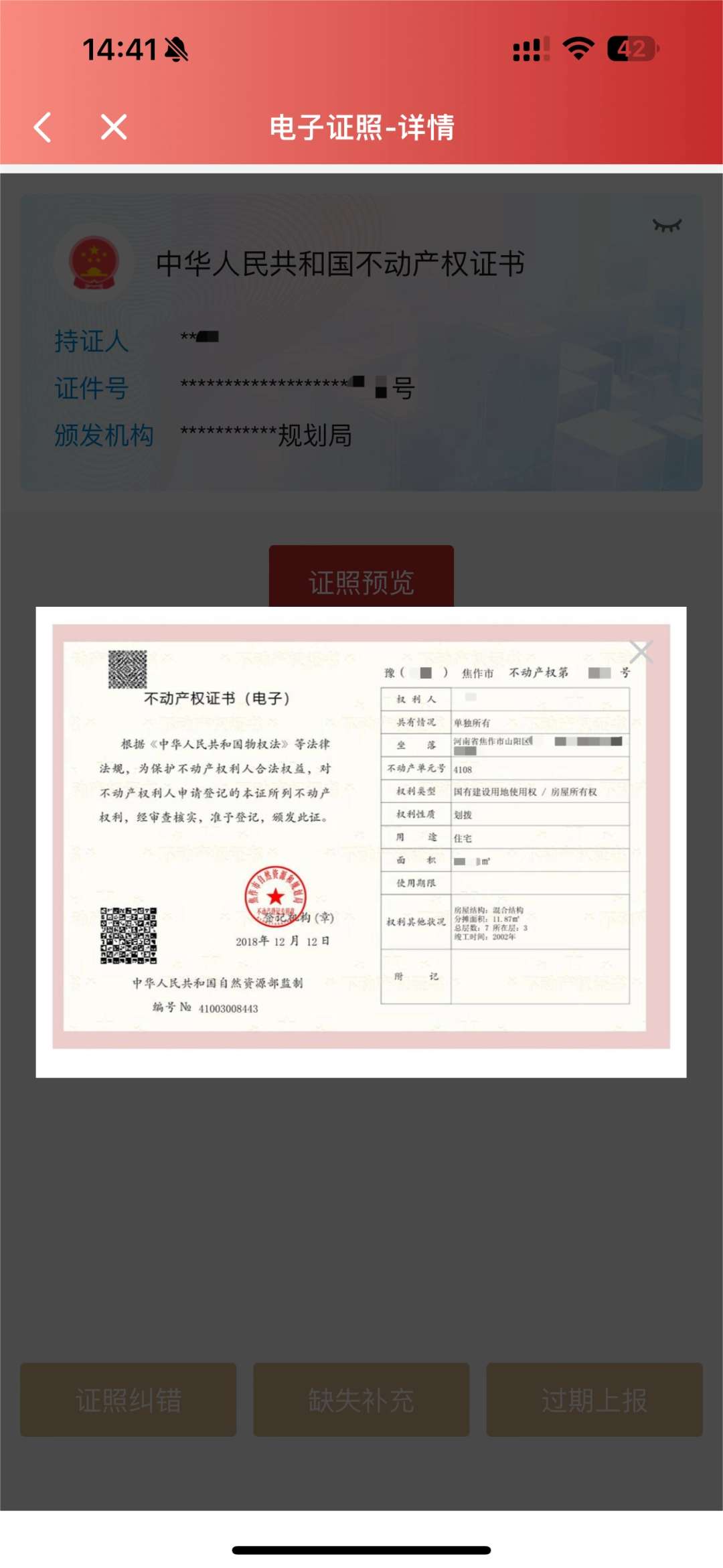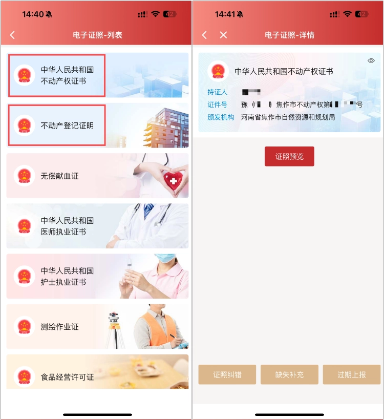 点击【中华人民共和国不动产权证书】或【不动产登记证明】,即可查看本人相关电子证照。