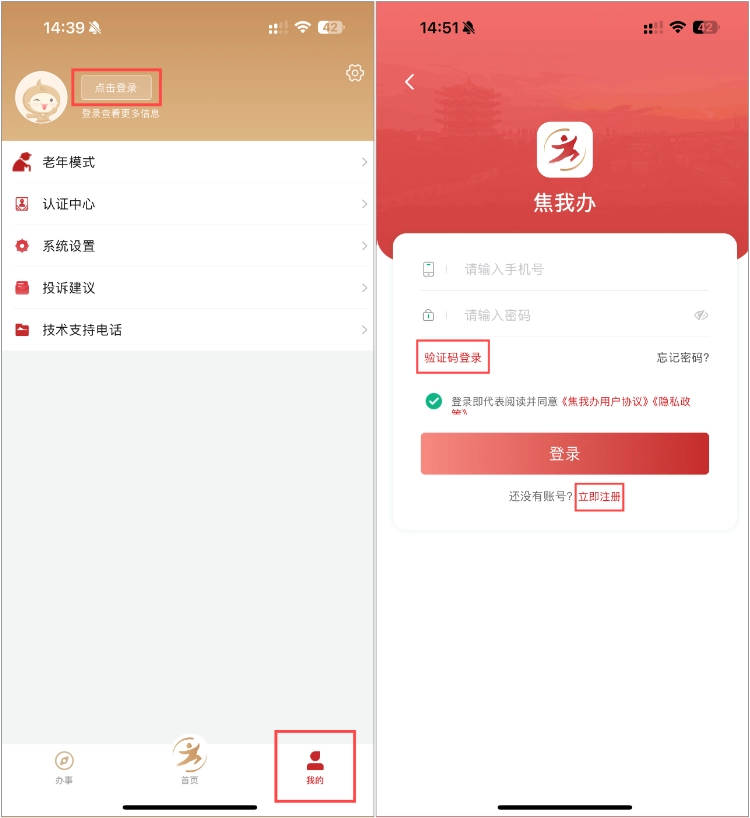 打开“焦我办”,点击【我的】-【点击登录】,注册登录账号。