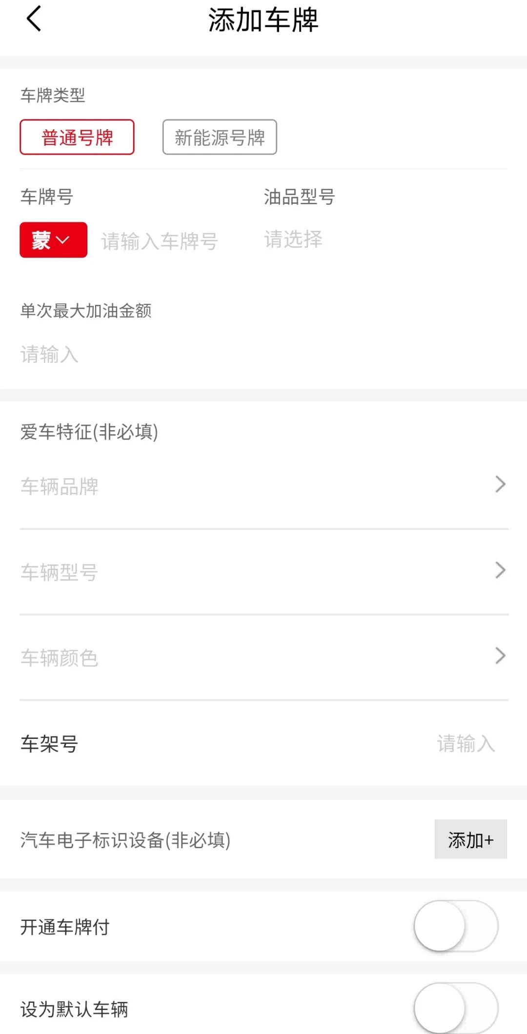 步骤二:完成注册登录操作后,进入首页添加车牌信息,接着设置油品型号,最后进行充值。