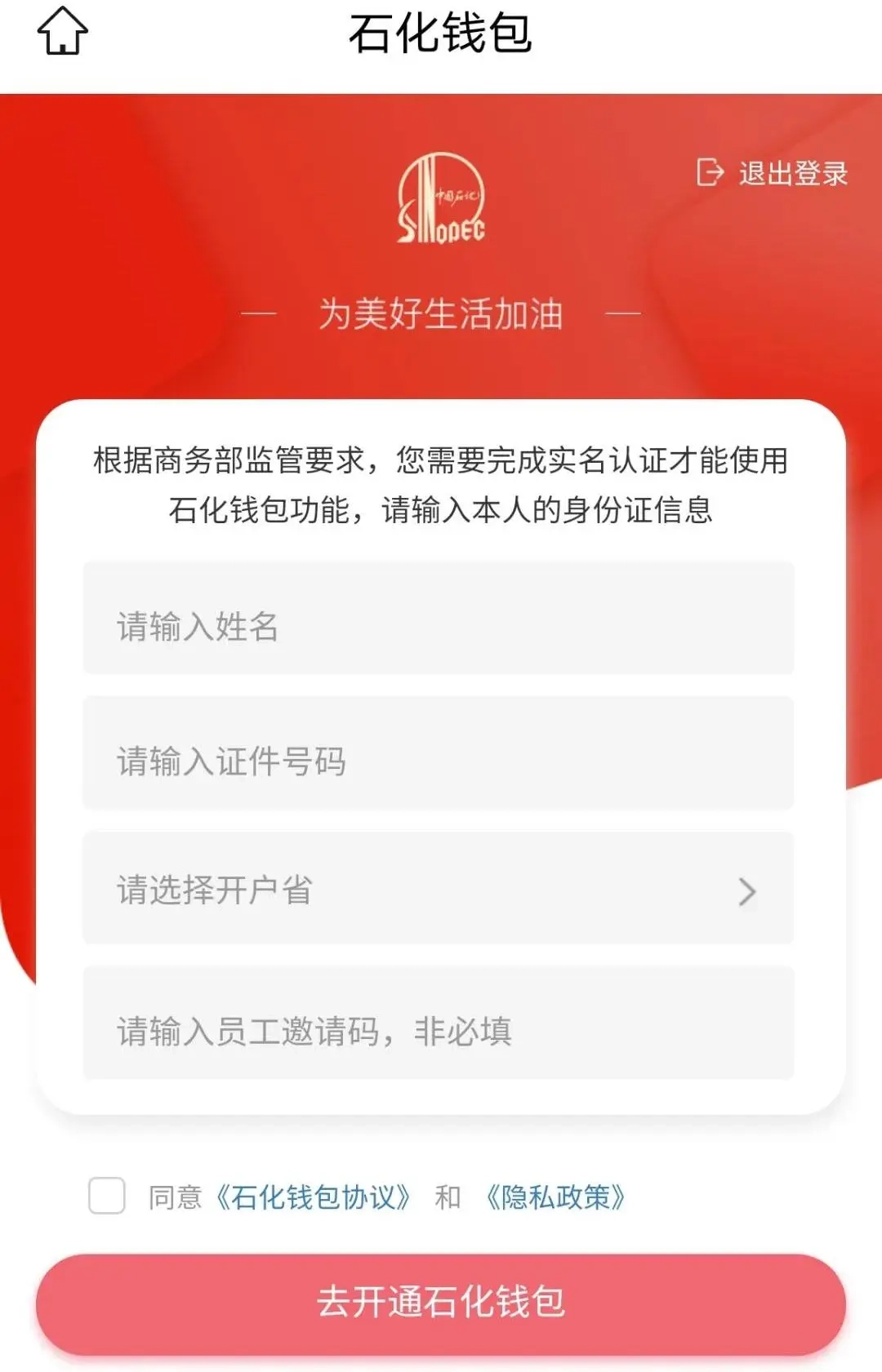 步骤一:打开“易捷加油”应用,若为首次使用,需先注册石化钱包并完成实名认证操作。